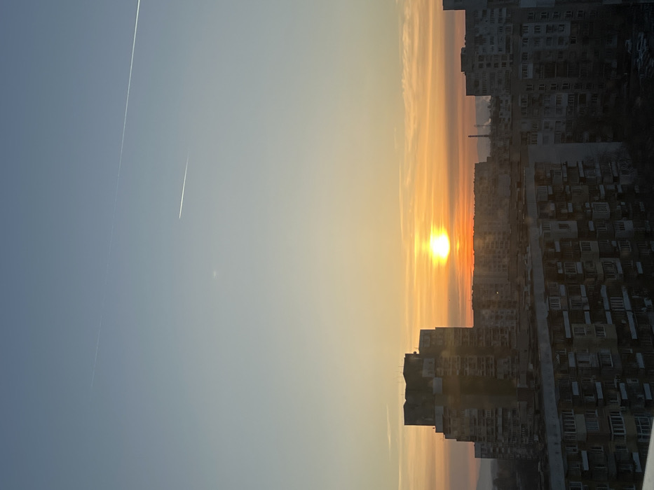 An elevated view captures an urban landscape in Sofia, Bulgaria, at either sunrise or sunset. The sky, occupying the upper two-thirds of the image, transitions from a clear light blue at the zenith to a vibrant orange and yellow hue at the horizon. A prominent, circular, bright yellow sun disk is positioned slightly left of the image's horizontal center, near the horizon line. Two faint white contrails are visible in the upper sky; one extends horizontally from the upper left, and a shorter, diagonal one is below it. A small, indistinct bright circular object is present in the upper left-center sky. The lower third of the image depicts a dense residential area. In the left-midground, a large, multi-story apartment complex with a distinctive stepped, Brutalist-style architecture is visible, appearing largely as a dark silhouette against the bright sky. Numerous other multi-story apartment blocks, characterized by rows of windows and balconies, extend across the midground towards the right, also largely in shadow. The architectural style of these buildings is consistent with post-war communist-era residential developments found in areas like Studentski Grad. In the far background on the left, a hazy outline of distant mountains is visible. On the right-hand side of the background, a tall, slender industrial chimney structure rises above the city skyline. No individuals or specific activities are discernible within the frame.
