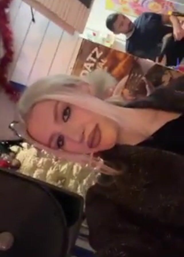 A woman with bleached blonde hair looks into the camera while dancing in what appears to be a bar or restaurant. In the background, a man wearing a dark shirt is sitting at the bar with other patrons. There is some holiday decor. The camera view is slanted.