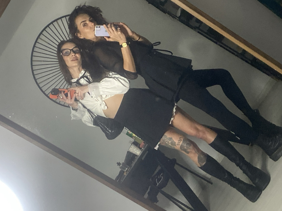 Two adult females are depicted in a mirror selfie taken indoors in Bat Yam, Israel. The female positioned to the left (viewer's left) has long dark hair and wears glasses. She is dressed in a white ruffled crop top with black ties, a black mini skirt with a white lace hem, and long black boots. Visible tattoos on her right leg include text appearing to be "דגים" (dagim - fish in Hebrew) and other designs. She holds an orange-cased smartphone with both hands, angled towards the viewer, appearing to be the photographer. The female positioned to the right has dark curly hair and wears a dark, possibly sheer, long-sleeved top, a dark pleated skirt, black leggings, and black boots. A gold-colored wristwatch is present on her left wrist. She holds a light purple-cased smartphone in her right hand. Both individuals are looking directly towards the camera's reflection. The background, reflected in the wooden-framed mirror, displays a light-colored wall adorned with a large, dark, semi-circular fan-like decorative object. To the left, a dark table with several indistinct objects is visible. A bright light source is reflected in the upper left corner of the mirror.