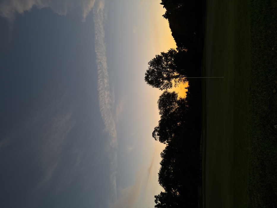 A static long shot captures a golf course scene at dusk or dawn, located in Vila Nova de Gaia, Portugal. The upper two-thirds of the frame depict a sky exhibiting a gradient from deep blue at the zenith to a vibrant orange-yellow band at the horizon. Several thin, wispy cirrus clouds are visible across the lighter blue sections of the sky. A dense, dark silhouette of a treeline, composed of various deciduous trees, extends horizontally across the middle ground, sharply contrasting with the illuminated sky behind it. In the foreground, a dark green golf putting green is visible, upon which a slender, white flagstick stands upright, topped with a small, light-colored flag. The immediate foreground consists of darker green, slightly coarser grass. No individuals, animals, or active subjects are present. The primary light source emanates from the obscured horizon behind the trees.