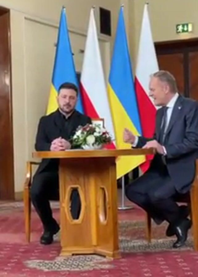 Two men are sitting at a small wooden table with a floral arrangement on top. To the left is a man in a black suit, and to the right is a man in a navy blue suit. Behind them are two Ukrainian flags and two Polish flags. The man on the right is gesturing with his right hand while speaking to the man on the left. A microphone is visible in the top left corner. The floor is covered with a red and maroon patterned rug. The walls are light-colored. An exit sign is visible in the background.