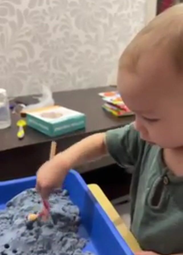 A young, light-skinned child with blond hair is seen in a close-up, playing with kinetic sand in a blue plastic tray on a yellow surface. The child is wearing a green, short-sleeved shirt. The child uses a small wooden stick to interact with the sand. In the background, a dark wooden surface holds various items, including a water bottle, a book or game box, and colorful items that seem to be a children's educational toy. The wallpaper behind is patterned with a swirling, floral design. Another person's hand enters the frame and puts another wooden stick into the blue tray.