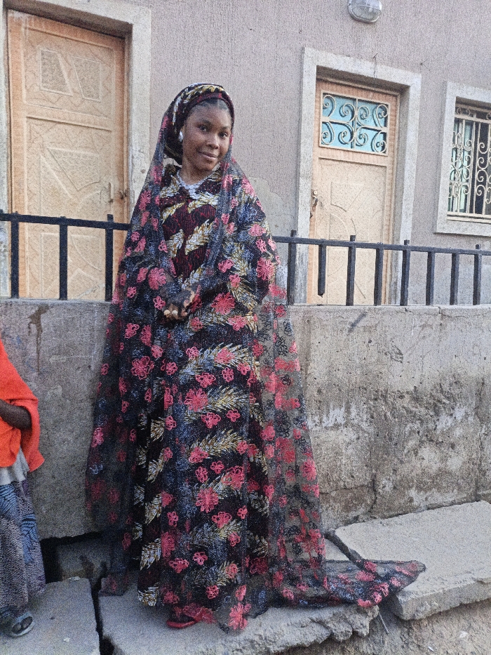 A young woman stands in front of a weathered building with three windows and two doors. She wears a patterned dress and a matching head covering. The dress is adorned with pink floral designs and has a long train. She stands on a concrete ledge in front of a short black fence. A small child in an orange top is partially visible on the left side of the frame.