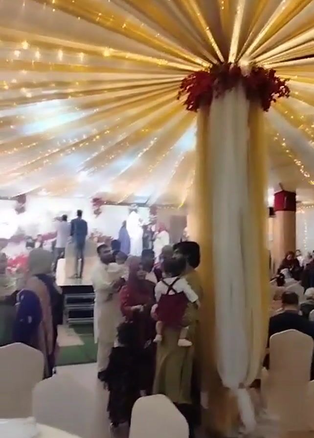 The video depicts a bustling wedding reception taking place indoors, with a large crowd of guests dressed in formal attire. Many attendees are engaged in conversation, while others mill about the venue. Several adults are holding young children. The focal point of the room is a raised stage area, where several people are gathered. The room is decorated with a striking ceiling design consisting of draped gold and white fabric, adorned with twinkling lights. Tables are set with white tablecloths, plates, and cutlery, suggesting that the event is soon to transition to a meal. The overall atmosphere suggests a celebratory and social gathering.