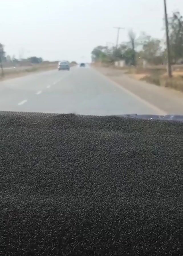 view from inside a moving vehicle, looking out over the dashboard through the windshield