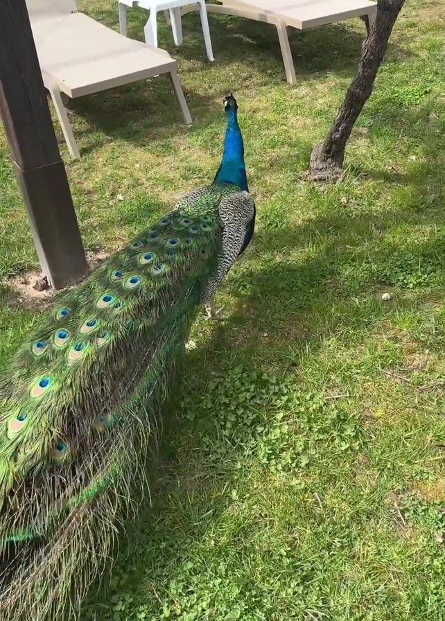 A peacock struts across a grassy lawn dotted with sun loungers and small tables