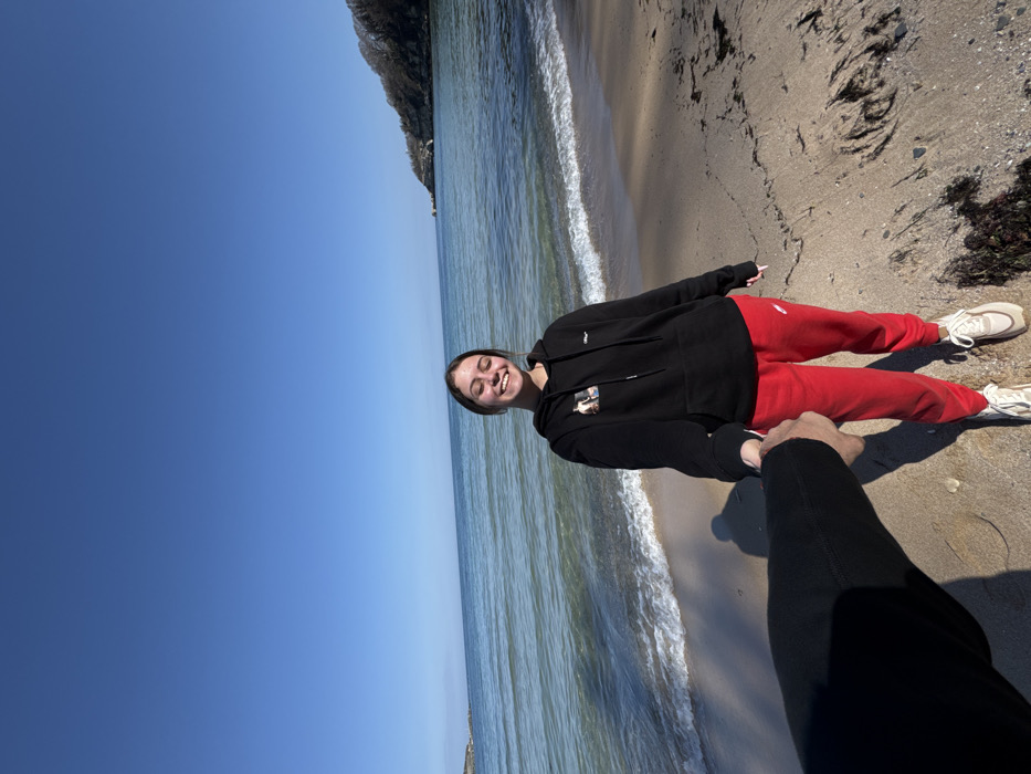 A wide-angle, eye-level photograph depicts a young woman standing on a sandy beach in Tsarevo, Bulgaria, under a clear blue sky. The woman, appearing to be a young adult, occupies the central foreground, smiling directly at the camera. She wears a black hooded sweatshirt with a light-colored graphic on the left chest, red athletic pants with a white logo on the upper left thigh, and light-colored athletic shoes. Her right hand is clasped by the left hand of an unseen individual, whose arm, clad in black, extends from the lower-left corner of the frame. The beach consists of light-brown sand with small waves from the sea washing ashore. Dark patches of marine vegetation are visible on the sand near the waterline on the right. In the background, a calm, light blue-green sea extends to a clear horizon. A tree-covered hill or cliff descends to the water on the right, forming a cove, while a distant landmass is visible on the left. Shadows are cast on the sand from the left, indicating bright sunlight.