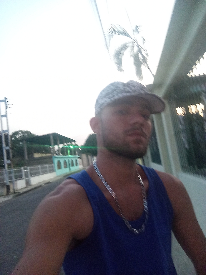 A man wearing a blue tank top and patterned cap stands outdoors. He has a beard and a silver chain necklace. A building with a green light is visible in the background, along with a street and trees. The sky is bright, possibly at dusk or dawn. A palm tree and a structure with white bars are also in the frame.