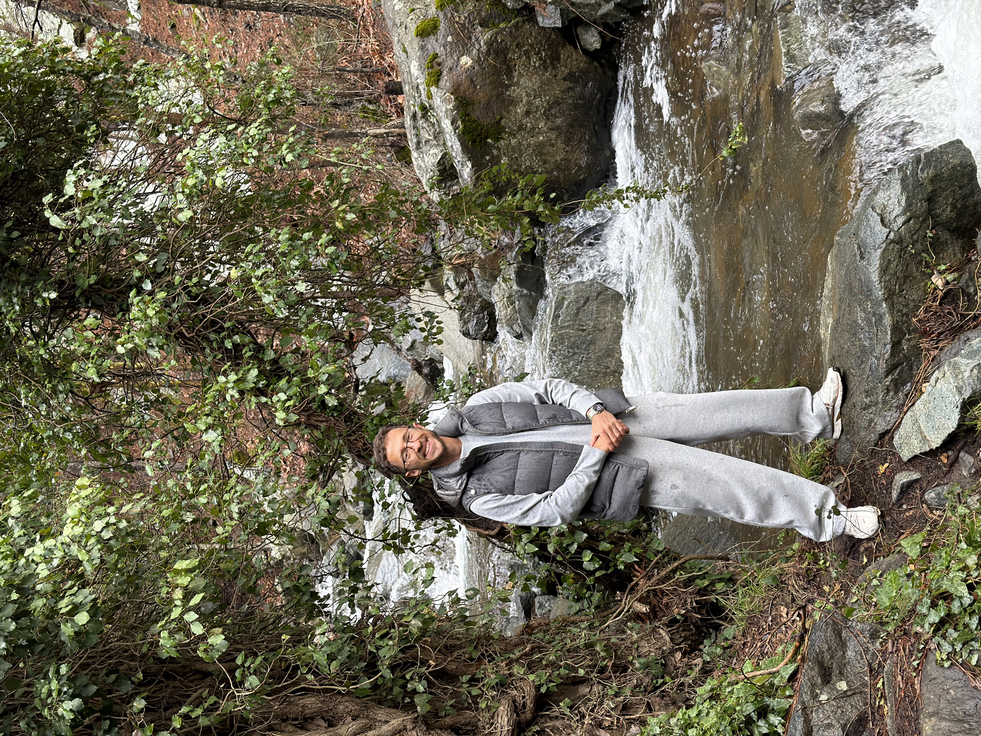 A man in a gray sweatsuit and vest stands next to a stream, smiling