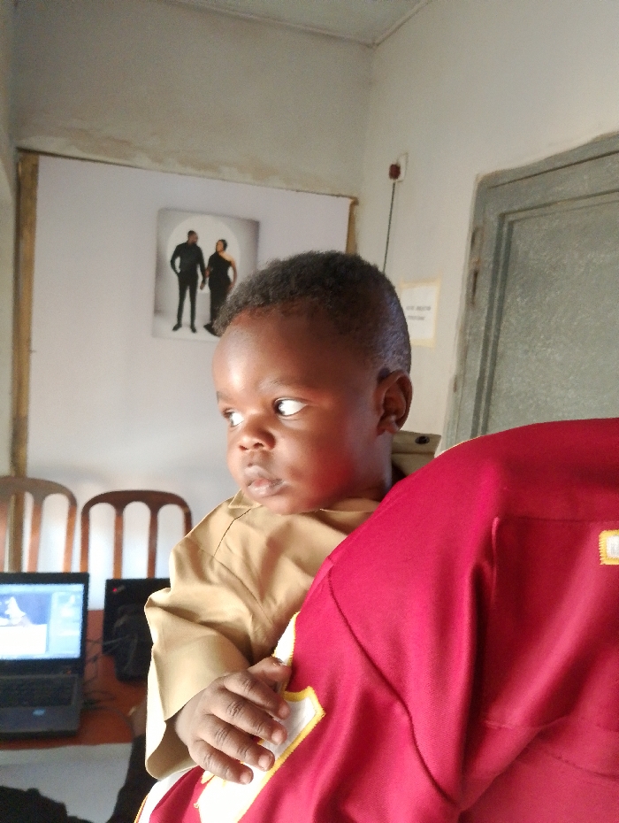 The image depicts an indoor scene, likely within a residence or small office setting in Jos, Nigeria. The primary subject is an infant of African descent, with short dark hair, seen from the chest up, positioned over an unseen individual's left shoulder. The infant wears a light tan, long-sleeved garment and looks to the left of the frame. Its eyes appear reflective, with prominent light-colored pupils. The infant's right hand rests on the red garment of the individual holding it, which features a partial yellow and white emblem or design. In the background to the left, a portion of a wooden chair with a slatted backrest is visible. Below it, on a light-colored surface, a silver-grey laptop is open and powered on, displaying a colorful image or video on its screen. A dark, rectangular object, possibly a speaker or monitor, is situated to the right of the laptop. The wall behind these objects is light-colored, showing some discoloration or staining near the ceiling. A framed or mounted photograph featuring two adults, one male and one female, both dressed in dark attire and standing, is affixed to the wall. To the right of the photograph, a red electrical outlet is mounted, from which a thin dark cable descends. Further right, a small yellow rectangular sign with illegible text is attached to the wall. On the far right, a dark grey door set within a light-colored frame is partially visible. No specific architectural or textual elements allow for a more precise determination of the location within Jos.