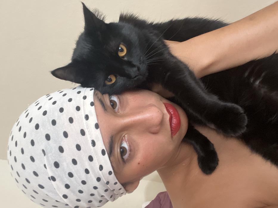 The image portrays an indoor scene within the city of Buenos Aires, Argentina. A female individual, exhibiting medium skin pigmentation, occupies the left and central areas of the frame. She wears a white head covering patterned with black polka dots. Her facial features include brown eyes, natural eyebrows, and red lipstick. Her right shoulder and upper chest are exposed. She cradles a black domestic cat, characterized by bright amber-yellow eyes, against her right side. The cat's head is oriented towards the viewer, and its front paws are visible near the individual's clavicle area. The background is indistinct, dominated by a plain, light-colored wall. A muted dark red or maroon object, likely fabric, is partially visible in the upper left corner, indicating an interior residential setting. Both the individual and the cat gaze directly towards the camera.