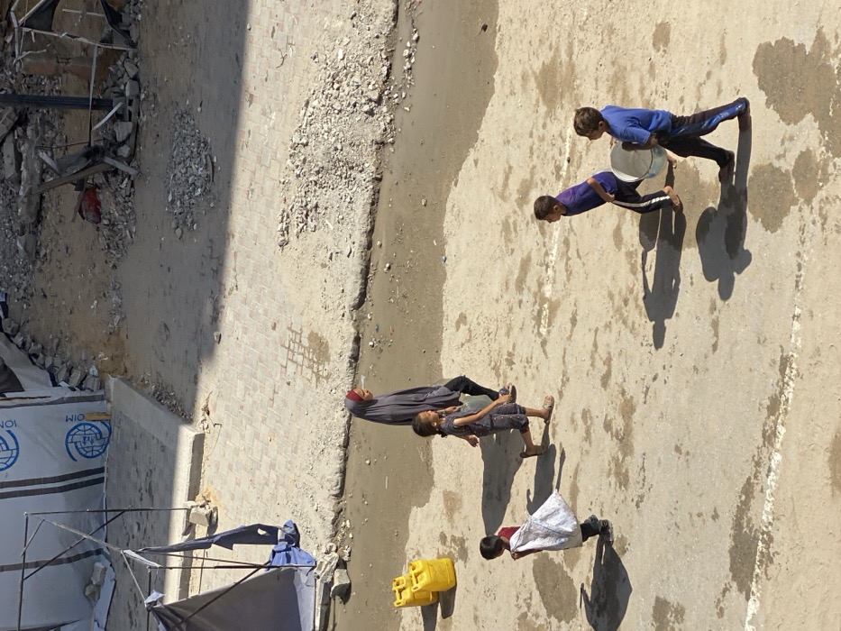 The image displays an outdoor scene in Deir el-Balah, Palestinian Territory, illuminated by direct sunlight, casting distinct shadows. The foreground and midground consist of an uneven surface of packed dirt, broken concrete, and a muddy channel running horizontally across the frame. Five individuals are visible: 1. An adult female, positioned center-left, walking from left to right. She wears a gray head covering and dark clothing. 2. A young girl, walking barefoot beside the adult female, wearing a patterned jumpsuit. 3. A young boy, positioned further left, walking independently. He wears a dark shirt and pants and carries a light-colored, possibly white, sack or cloth over his left shoulder. 4. Two young boys, positioned mid-right, jointly carrying a large, white, cylindrical container or bucket. One boy wears a purple shirt with striped pants, and the other wears a blue shirt and dark pants. In the mid-left, two bright yellow plastic jerrycans rest on the ground. The background reveals significant environmental damage and makeshift structures. To the far left, a tent-like structure with metal framing is covered by white tarpaulin, visibly marked with the "IOM" (International Organization for Migration) logo. To the right and rear, extensive piles of rubble, including concrete fragments and exposed rebar, indicate destroyed or heavily damaged buildings.