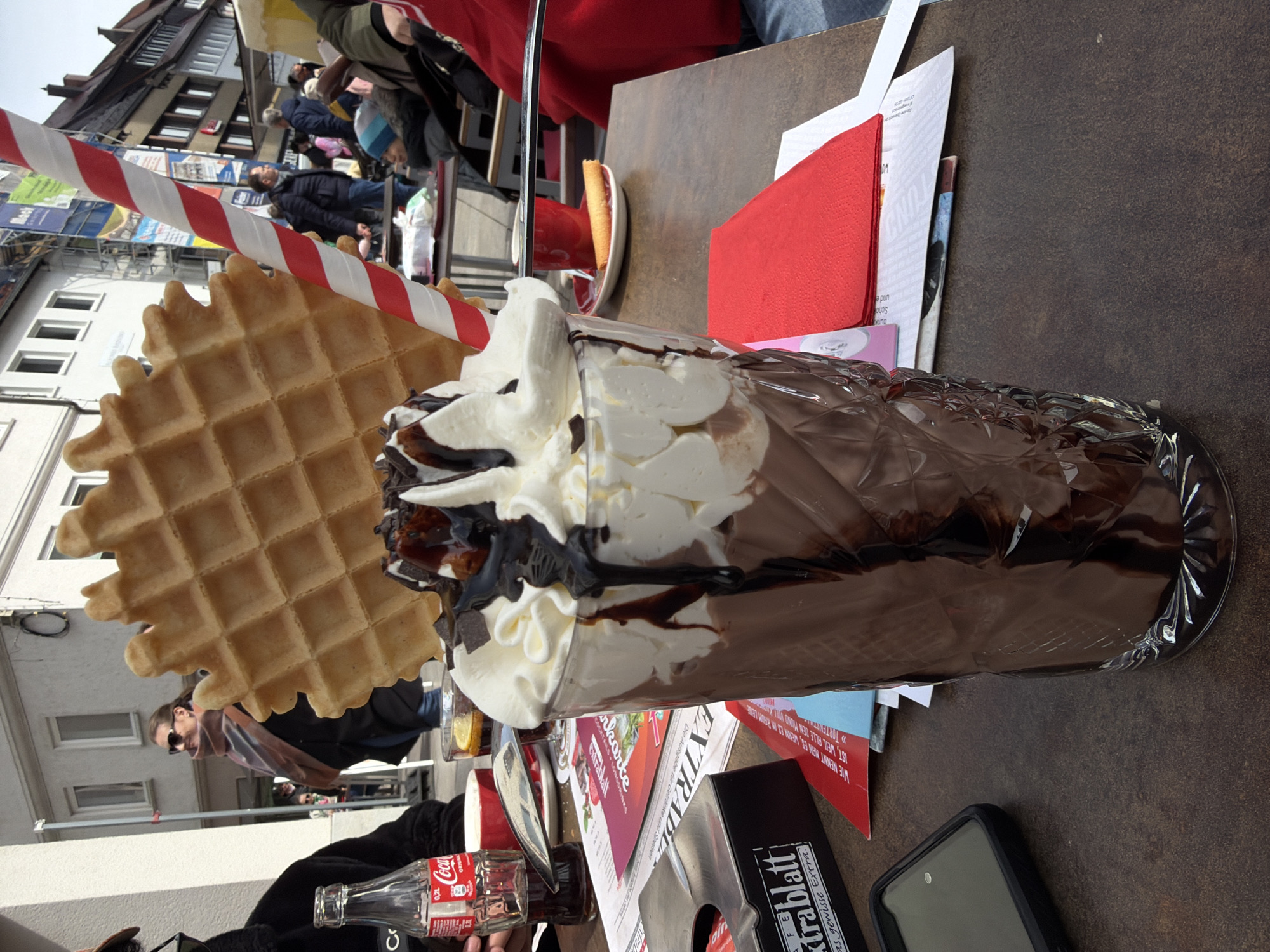 The image depicts an outdoor cafe table scene in Ulm, Germany, specifically at a Cafe Extrablatt location. In the foreground, a tall, faceted glass beverage dominates the center, filled with a dark chocolate drink base, topped generously with whipped cream, dark chocolate syrup drizzle, chocolate shavings, a large circular waffle cookie, and a red and white striped straw. On the dark brown, textured outdoor table, additional items include a 0.2-liter Coca-Cola bottle, a black tissue dispenser labeled "Cafe Extrablatt," and a black smartphone on the left side. To the right, a red ceramic coffee cup rests on a white saucer with a small golden-brown biscuit. A partially visible clear glass containing a beverage with a lemon slice is also present. Several paper menus and flyers, some with German text, are scattered across the table. In the mid-ground, a partial view of a person in dark clothing is seen to the immediate left. Further left, a woman wearing sunglasses and a multi-colored scarf over a dark coat is walking away. To the right, blurred figures include an individual in a blue jacket and a child wearing a blue and grey striped knit hat. The background reveals a bustling urban streetscape. To the left, light-colored buildings with multiple rectangular windows are visible. Scaffolding with advertising banners, including one clearly displaying "Mock," is present on or near these structures. To the right, older, multi-story buildings with pitched roofs are visible under a bright, overcast sky, characteristic of a German city center or pedestrian zone.