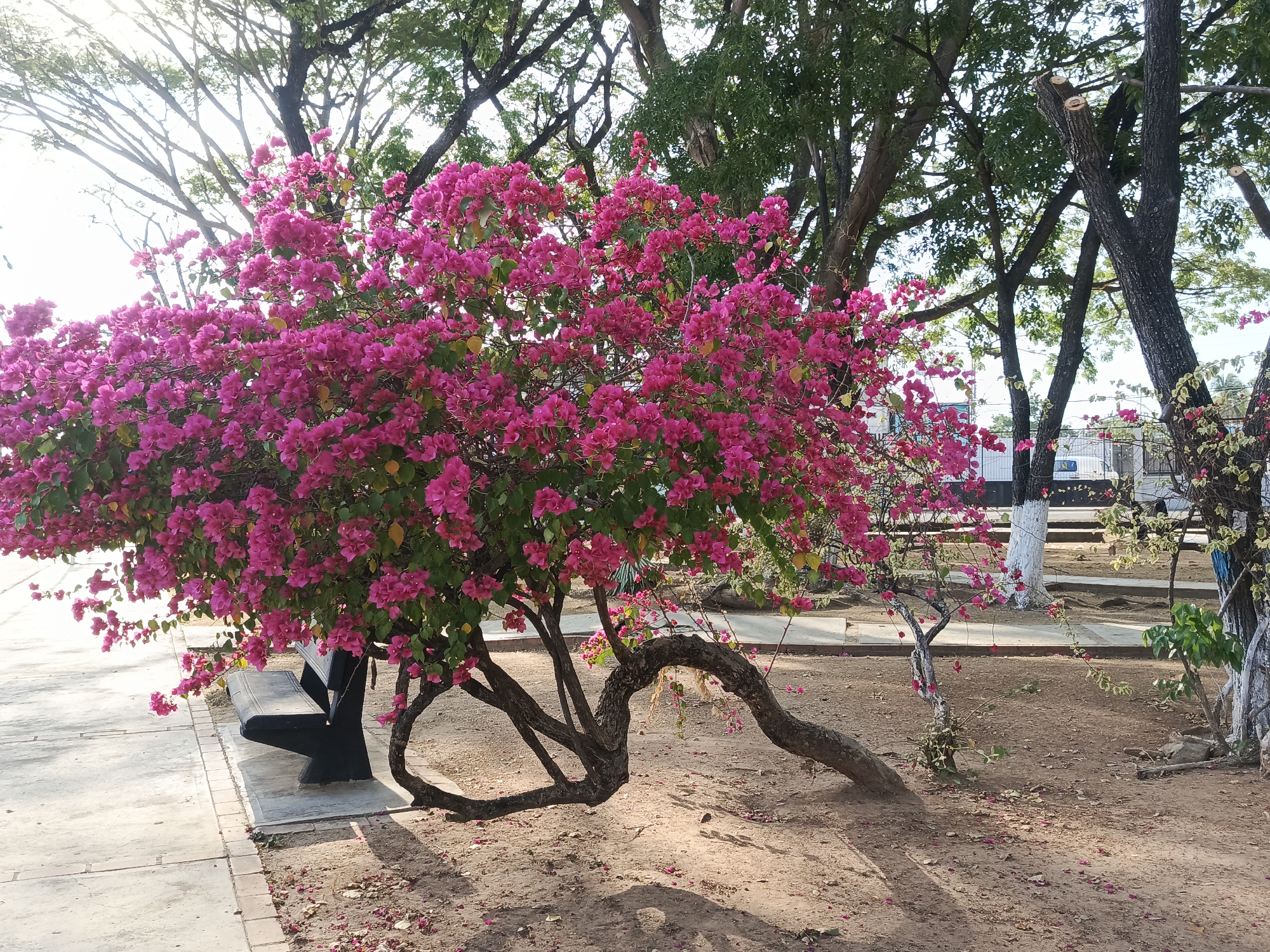The image captures a scene in a park setting, likely in a city due to the presence of structures in the background. The foreground is dominated by a vibrant bougainvillea tree, densely covered in bright pink flowers. Its unique, gnarled trunk branches out and dips low, with some segments appearing to nearly touch the ground. A black park bench sits partially obscured beneath the canopy of the bougainvillea, its placement suggesting a shaded resting spot. The ground is composed of dirt, scattered with fallen pink blossoms. Sunlight filters through the leaves of taller trees in the background, creating dappled shadows on the ground. Beyond the bougainvillea, there are other trees, some with whitewashed lower trunks. In the distance, there are glimpses of buildings and a fence. The overall impression is one of a serene and well-maintained urban park.