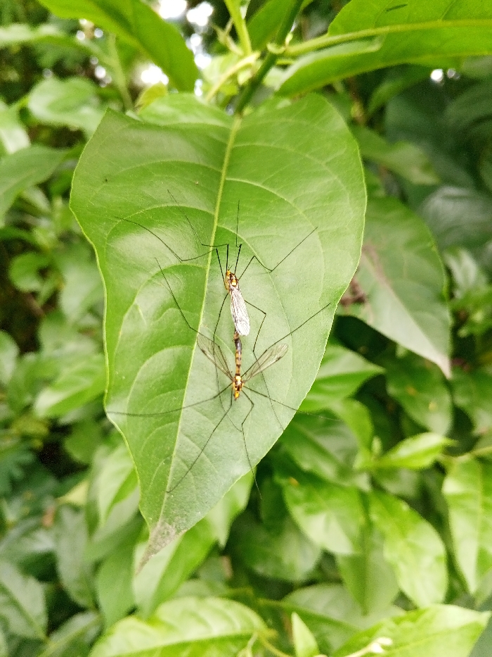 - "The image displays two crane flies (likely Tipulidae species) engaged in copulation, positioned centrally on a single, vibrant green leaf" by FM-awG1o1, licensed under CC BY 4.0
