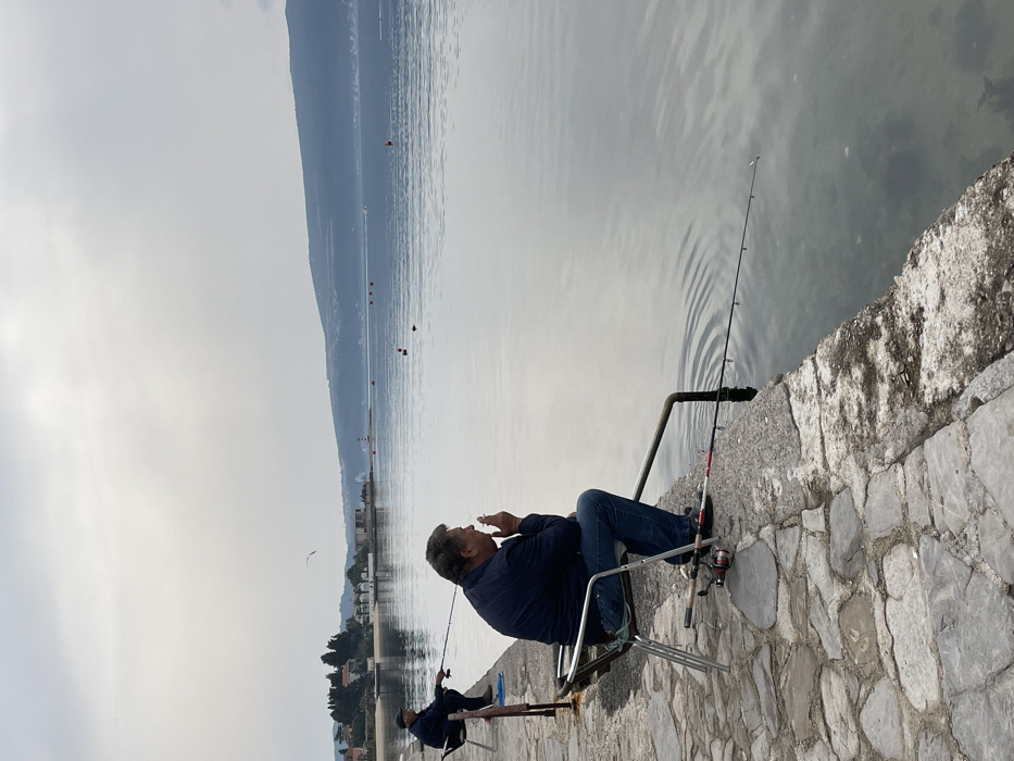 The image depicts a tranquil waterfront scene in Donja Lastva, Montenegro, under an overcast sky. Two adult males are fishing along a stone-paved promenade. In the foreground, a man with short dark hair, wearing a dark blue jacket and blue jeans, sits on a silver folding chair. He is facing right, smoking a cigarette held in his right hand. A fishing rod with a red and white tip is propped beside him, extending into the calm, reflective water. A metal handrail extends from the promenade into the water near his position. Further down the promenade to the left, another man, wearing a dark cap and jacket, sits on a dark folding chair, also fishing with a rod extending into the water. The background features the waters of a bay or sea, dotted with several red buoys and a distant small white boat. Beyond the water, a low coastline on the left shows residential buildings, trees, a small sandy beach, and a distinctive lighthouse structure with red and white stripes. To the right, a large, dark green mountainous landmass slopes down towards the water. A single seagull is visible flying in the sky above the left coastline. The water surface displays subtle ripples near the foreground.