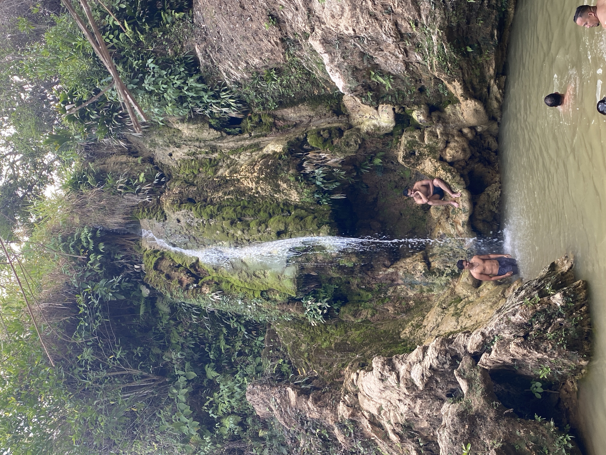 The image depicts a natural waterfall and pond, likely a popular recreation spot. Two shirtless men are near the waterfall: one sitting on the rocks, and the other stands under the falling water. Two additional people are swimming in the pond. The environment features lush greenery and rocky terrain. It is likely located in Santa Rosa, Venezuela.