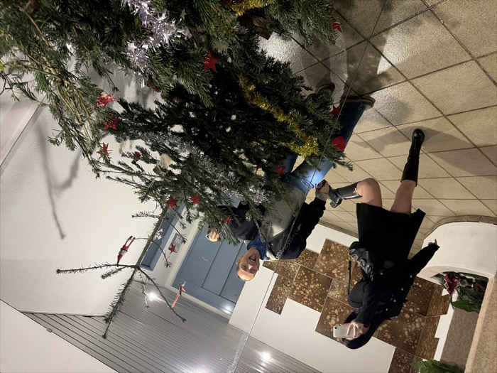 Two people stand near Christmas trees indoors. A person in jeans and a jacket holds a tree, and another person, wearing a black dress, boots, and a coat, takes a photo with their phone. The background includes tiled floors, walls, and a glimpse of plants. The trees are decorated with tinsel and red star ornaments. The image is rotated, giving a tilted perspective.