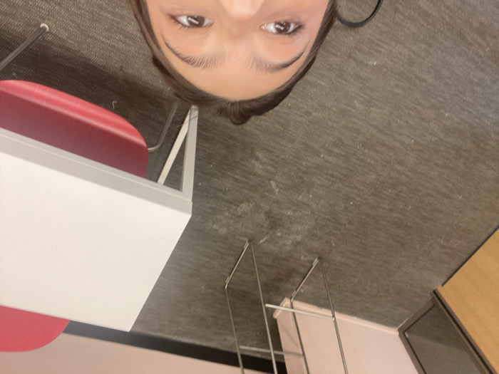 The image displays an indoor scene, captured from a low-angle perspective. The upper portion of a person's face, including their forehead, dark eyebrows, and eyes, is visible at the bottom of the frame, looking towards the camera. A dark cable or strap is partially visible near the left side of their face. The background features a dark grey, textured carpeted floor with visible wear marks. In the upper left, a light brown wooden door with a dark frame and a glass panel is partially visible. Adjacent to the door, a light pink wall with a dark baseboard is present. A silver-colored metal stand, characterized by multiple vertical and horizontal bars, occupies the central background. To the right, a white rectangular table with white metal legs is positioned, under which a red chair with a plastic seat and metal legs is partially visible. No specific visual cues within the image definitively indicate the location as Miami, United States of America.