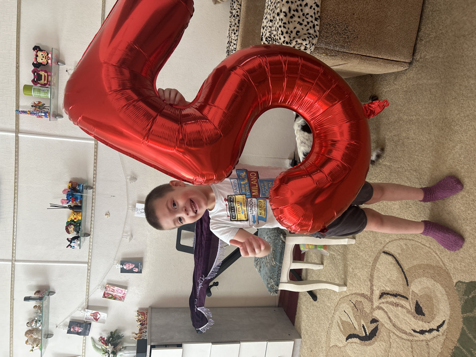 This image depicts an indoor residential setting in the city of Фоки, Russia. A young male child, appearing approximately five to seven years old, stands centrally, facing and smiling broadly at the camera. He has short brown hair and is wearing a white short-sleeved t-shirt with multi-colored text graphics, dark shorts, and purple socks. His left hand is raised, forming a thumbs-up gesture. His right hand holds a large, shiny red metallic foil balloon shaped like the number "5," positioned to his right. To the right and behind the child's legs, a small black and white dog is partially visible, lying on a patterned carpet. The floor is covered by a beige carpet with a brown curvilinear pattern. In the background, against a light-colored wall with decorative molding, a white chest of drawers is visible on the far left. A dark purple fringed fabric cover drapes over what appears to be an electronic keyboard on a stand, positioned behind a light-colored upholstered stool with ornate white legs. Two wall-mounted glass shelves are present: the upper left shelf holds various small figurines, and the lower right shelf contains decorative items and a reed diffuser. A string of photographs or cards is clipped to a line strung across the wall below the shelves. The room is brightly lit.