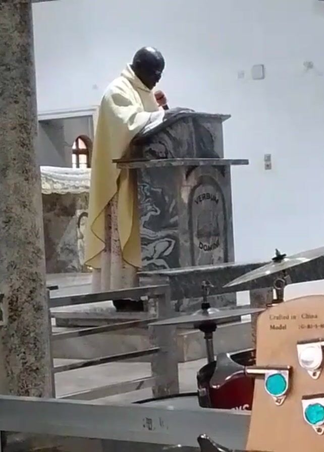 A man in a white robe and black shirt stands at a podium inside a church. He is holding a microphone and appears to be giving a speech or sermon. The podium has the words "VERBUM DOMINI" inscribed on it. Behind the podium, there is an image of a person on the wall, possibly a religious figure. To the right of the podium, there is a set of drums. The church's interior is white, with a gray marble structure in front of the podium and a gray marble pillar on the left side of the screen.