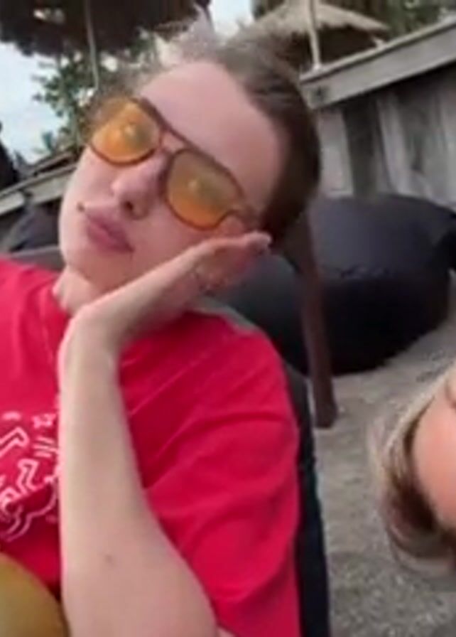 three women lounging on a beach. One is centered in the foreground, wearing a red shirt, orange sunglasses, and jewelry; she is holding a cellphone and a coconut. Another woman is lying on the sand beside her, smiling with her head tilted to the side. The third woman is seated behind them, partially visible. The background includes a sandy beach, tropical vegetation, a wooden structure, and tables with coconuts on them.