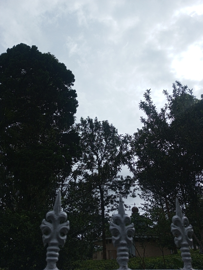 The image displays an outdoor scene in Ciherang, Indonesia, viewed under an overcast, light-grey sky. In the immediate foreground, three grey metal fence finials, stylized with elaborate scrollwork and partially out of focus, are positioned along the bottom edge of the frame. The midground and background are dominated by dense, dark tree canopies and foliage, largely appearing as silhouettes against the bright, cloudy sky. A substantial, dark-leaved tree occupies the left side of the frame, while other trees with more discernible branches and leaves fill the central and right areas. Partially obscured by the trees in the central-right background, a light-colored building with a dark roof and a small, dark, spherical object atop it is faintly visible. No individuals or specific actions are observed.