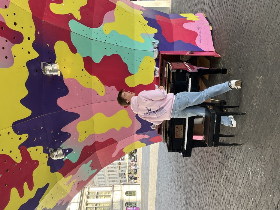 - "A young, light-skinned male stands on a paved public square in Ghent, Belgium, positioned behind a black upright piano" by FM-NQrs03, licensed under CC BY 4.0