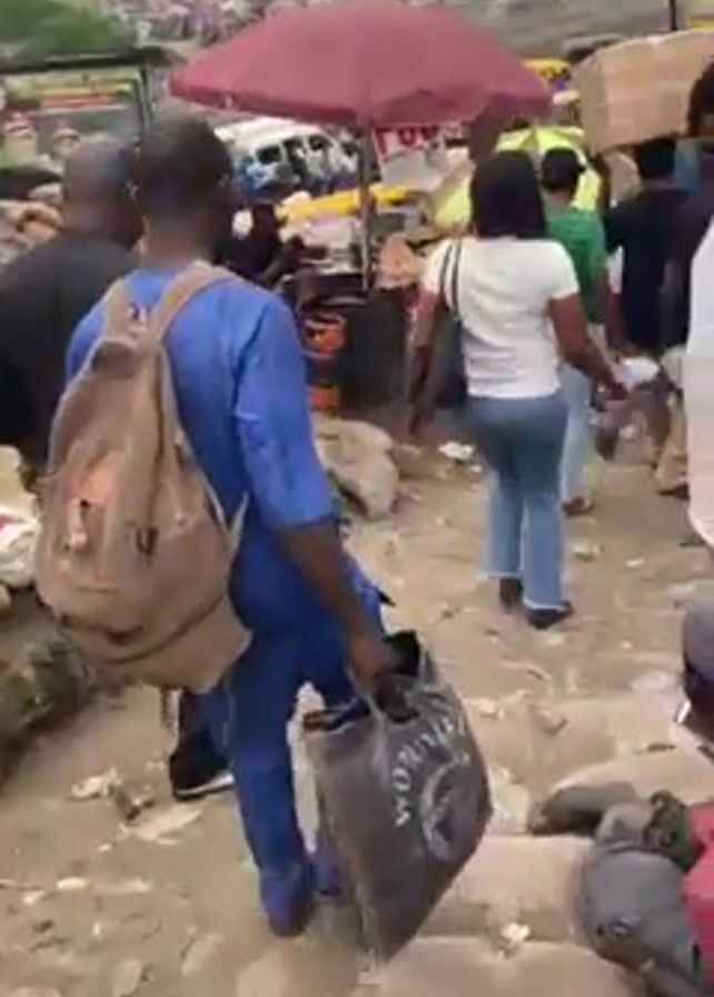 crowded outdoor marketplace or transportation hub. People are walking in different directions. Some are carrying bags or boxes. One man is sitting on concrete steps, using a phone. Stalls with goods like food and produce are visible. There are umbrellas for shade. The ground is uneven and looks dirty. There are gas tanks near a food stall.