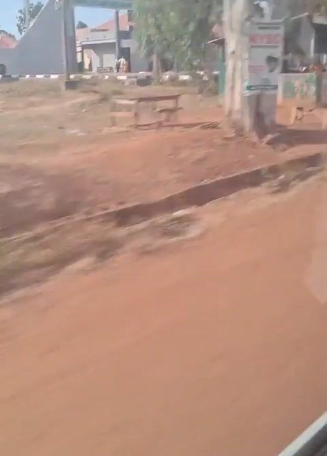 A camera traveling by the side of a road shows the exterior of an area with red dirt and various buildings and trees. The first building is a grey structure with an open archway. The next area has a small shack-like structure with a corrugated roof. A sign is seen next to a tree. Finally, a sign for "Dawah Ladi Local Government Secretariat P.M.B. 2003" is seen in front of a gate with trees. Some people are walking into the gate as a motorcycle drives by. The area is dry and dusty.
