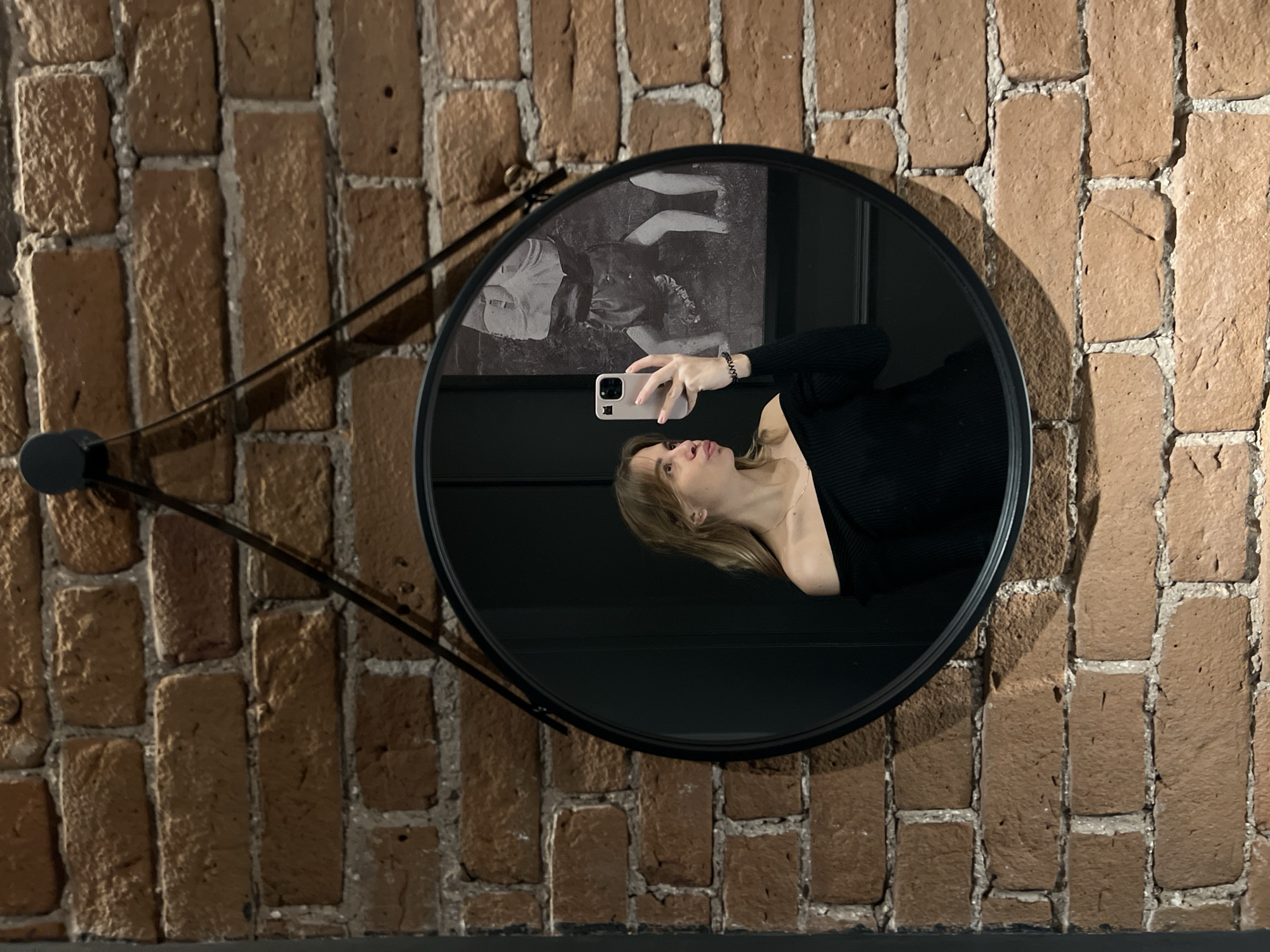 - "A person in a black top is reflected in a circular mirror against a brick wall" by FM-1eZMB2, licensed under CC BY 4.0