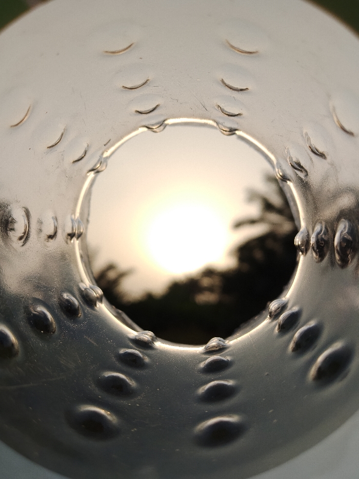 A close-up shot captures a silver, textured ring with a central circular opening. The ring's surface is adorned with rows of embossed, rounded shapes. Through the aperture, a blurred view of a bright, sunlit sky is visible, with dark silhouettes of trees or foliage in the lower portion. The image suggests a unique perspective, focusing on the tactile qualities of the ring and the contrast between its metallic texture and the soft, natural light beyond.