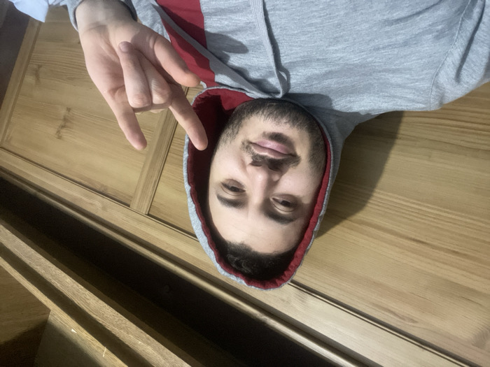 A man lies sideways, wearing a gray hoodie with red trim. His face is visible inside the hood, and his hand is raised, making the "rock on" hand gesture. He has short dark hair and a trimmed beard. The background appears to be a wooden surface, possibly a door or wall paneling with a visible shelf. The lighting is somewhat dim, casting shadows on the wooden surface.