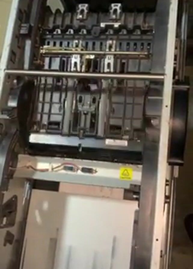 internal workings of a large format printer. The camera is positioned above the machine, offering a view into its inner components. The printer appears disassembled, revealing a complex system of gears, rollers, and electronics. At the bottom of the frame, a sheet of paper is visible, presumably waiting to be printed. There is a brief whirring sound, followed by the activation of a motor-driven mechanism. This part moves quickly along the horizontal axis. The mechanism then comes to a stop. A yellow caution label is visible, attached to one of the interior panels. The environment suggests a workshop or repair setting.