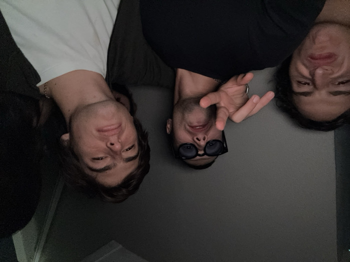 The image displays a close-up, dimly lit scene featuring three young adult males in an interior setting. No specific location within South Bend, United States, is discernible from the available visual information. From left to right: 1. A male subject, with only the left side of his face and dark, wavy hair visible, making a "duck face" or pouting expression. 2. A central male subject, wearing dark sunglasses and a black t-shirt. He has short facial hair and is looking towards the camera with his mouth slightly open. His right hand is raised, fingers splayed and slightly bent, pointing in the general direction of the camera. A silver-colored ring is visible on his left pinky finger. 3. A male subject positioned on the right, wearing a white t-shirt and a dark outer garment. He has dark, medium-length hair and a neutral expression, looking directly at the camera. A gold-colored chain is visible around his neck. The background consists of a uniform dark gray surface, indicative of a wall or similar structure in a poorly lit room. The overall lighting is low, casting soft shadows and limiting detail. The composition suggests a close-range photograph, potentially a selfie.
