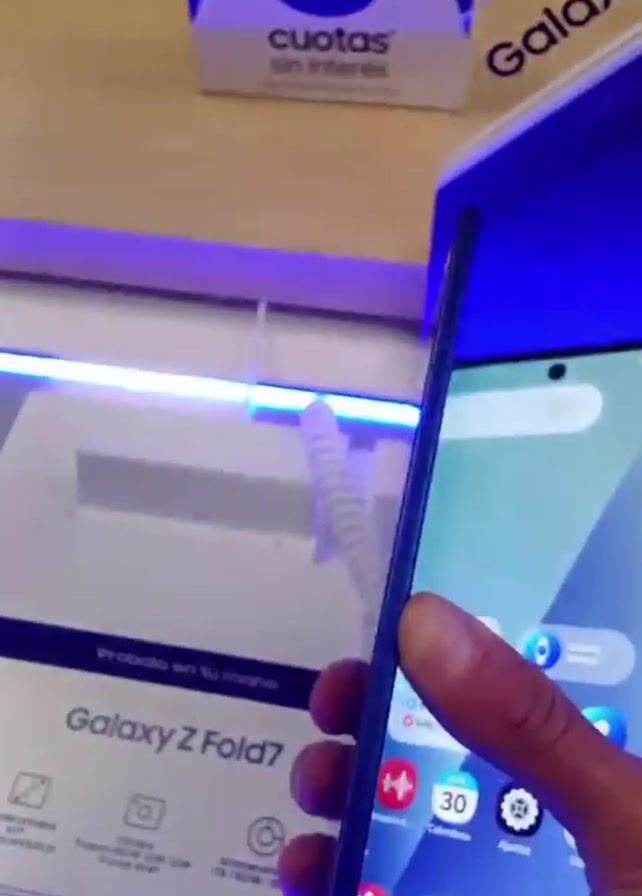 A hand manipulates a foldable Samsung Galaxy Z Fold 5 smartphone on a display table in a store setting. The phone is shown folding and unfolding, displaying its internal screen. Above the phone are signs advertising "3 cuotas sin interés" (3 installments without interest) and the phone model "Galaxy Z Fold." The background features other store displays and a bright blue light.