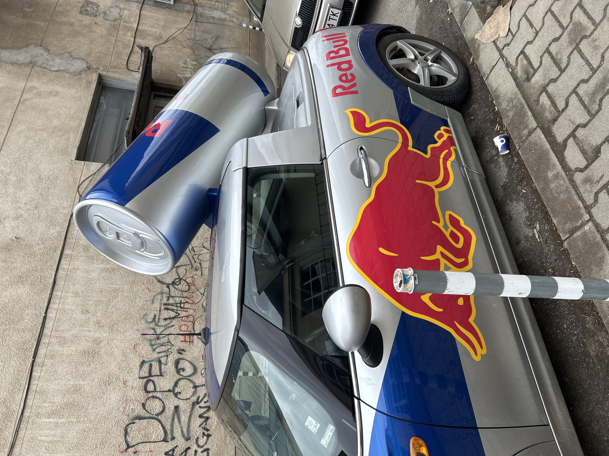 Red Bull promotional car parked on a city street. The car is a silver Mini Cooper adorned with Red Bull branding, including the company logo and oversized cans of Red Bull mounted on the rear. The car is parked next to a sidewalk with brick pavers. Behind the car is a building with graffiti on the wall. A striped metal pole is in the foreground. The license plate of another car is visible in the background. The location is the city of Sofia, Bulgaria, indicated by the license plate.
