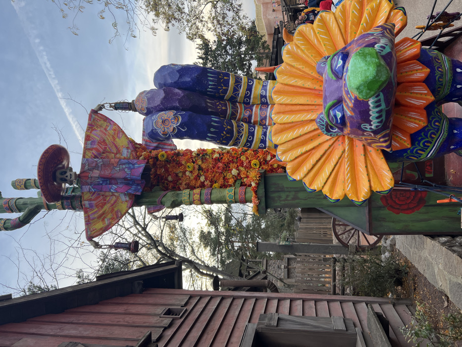 The image displays a vibrant, themed outdoor scene located in Frontierland at Disneyland Paris in Chessy, France. In the foreground, a large, multicolored statue of an *alebrije*-style creature, resembling a stylized lion, is prominent. This creature features a bright orange fan-like mane, a purple body with intricate blue, orange, and green patterns, a green snout, and blue eyes. It is positioned in front of a tall, green structural base, which is abundantly decorated with orange and yellow flowers, suggestive of marigolds. Rising from this floral base is a tall, slender green pole designed to resemble a cactus, adorned with colorful bands. Attached to this cactus pole is a skeleton figure, depicted wearing a red-brimmed sombrero and a brightly patterned poncho. The skeleton holds a small, dark lantern in each outstretched hand. To the left of the central display, a rustic, reddish-brown wooden building with horizontal plank siding and a closed window shutter is partially visible. The ground in the lower left foreground shows sparse foliage and dirt. In the background, deciduous trees with bare branches are visible under a partly cloudy sky, which features a faint, white contrail. Further back on the right, indistinct figures of people can be observed, alongside additional theme park structures consistent with a Western-themed environment.