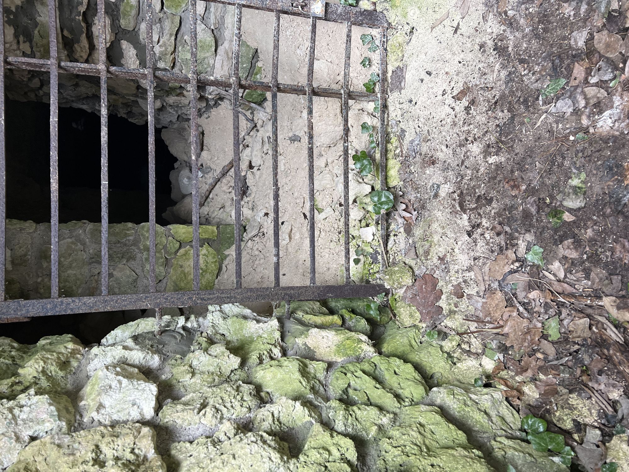 The image depicts a barred opening leading to a dark space, possibly a well or a cellar