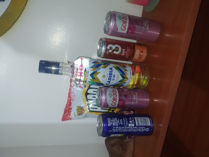 The scene depicts an array of alcoholic beverages and snacks arranged on a polished brown wooden surface against a plain white wall. A partial gold circular decorative element is visible in the upper right background. The location is specified as Thika Township ward, Kenya. From left to right: 1. A dark-skinned human hand with dark nail polish (possibly maroon or deep red) is partially visible on the far left, resting near or behind the first can. 2. A blue aluminum can with white text and a recycling symbol is positioned upright. Specific brand details are illegible. 3. A pink aluminum can, branded "GORDON'S PINK GIN & TONIC," stands upright. 4. Behind the cans, a white bag of snacks with red and yellow accents is partially visible. The text "Tropical HEAT" is legible, and below it, a brand name resembling "INDOMIE" is discernable. 5. A clear glass bottle with a dark blue cap and a colorful label, identifying it as "CARIBIA GIN," stands upright. The liquid inside is clear with a yellowish tint. 6. A reddish-brown aluminum can, branded "3 GIN & TONIC SPICED ORANGE," with "5% ABV" clearly visible, stands upright. 7. Another pink aluminum can, identical to the first, branded "GORDON'S PINK GIN & TONIC," stands upright. 8. On the far right, a small, pink or red object is partially visible, resting on a green circular mat. Its specific identity is indeterminate. All items are stationary and appear to be arranged for consumption or display. There are no active interactions or visible movement within the captured frame.