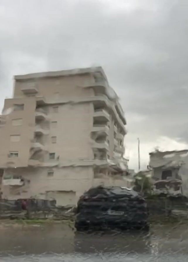 scene in what appears to be a town or city on a very rainy day. The view is from inside a vehicle, and the rain is heavily impacting the windshield, creating distorted vision. In front of the vehicle is a dark-colored car. In the background, there's a multi-story apartment building with balconies, its color a pale beige or light cream. To the right, partially visible, is another building with a damaged roof. The overall atmosphere is bleak and suggests a possible storm or heavy rainfall situation.