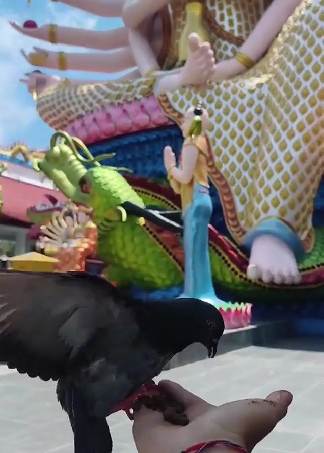 person feeding a pigeon from their hand, with a temple in the background. The pigeon, mostly gray with black wing tips, stands on the person's open palm, eating from the small pile of seeds they are holding. The person's hand has a multi-colored friendship bracelet. Behind the person, there's a large, ornate temple statue with numerous arms, painted in gold, pink, blue, and white. A green dragon statue is situated at the base of the figure. Small human statues stand nearby, and the sky is visible with some clouds.