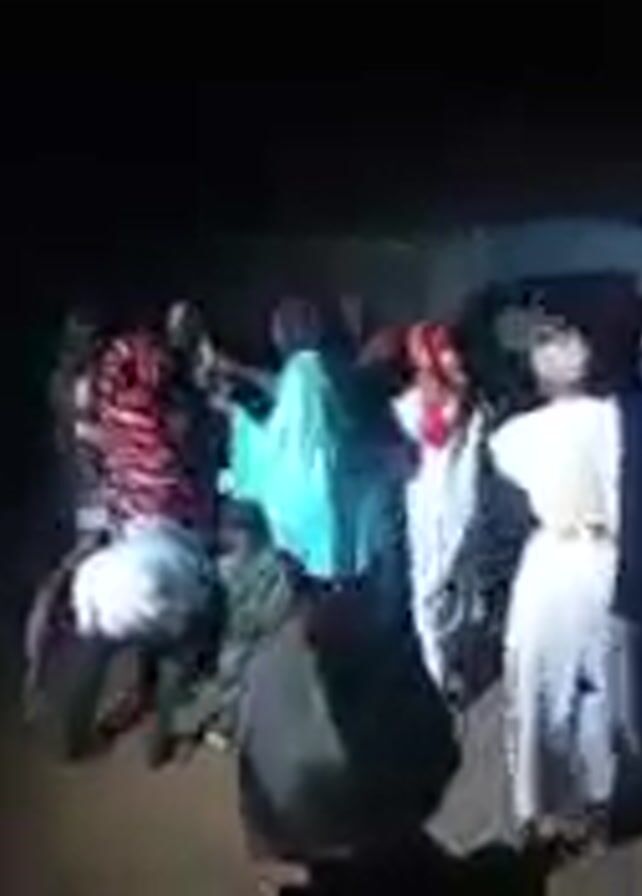 group of approximately ten people gathered in a dark outdoor setting. Most are standing, while at least one person appears to be kneeling or sitting. Some individuals are wearing brightly colored clothing. The video is low quality, so many details are unclear. It is difficult to discern the specific actions or interactions of the group.