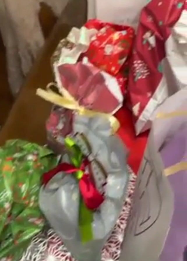 The camera pans across a table covered with numerous wrapped gifts of various sizes and colors