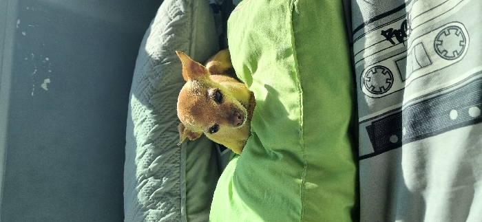 - "A tan chihuahua peers out from between a light green garment and a quilted gray one" by FM-rGZrc2, licensed under CC BY 4.0