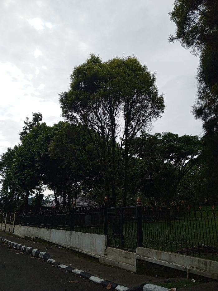 A somber, overcast sky looms over a lush scene. Trees dominate the view, with a large, rounded tree taking center stage. A wrought iron fence runs along the bottom, separating the trees from a paved road with a black and white curb. A glimpse of a building's tiled roof peeks from behind the trees. The scene suggests a park or estate on a cloudy day.