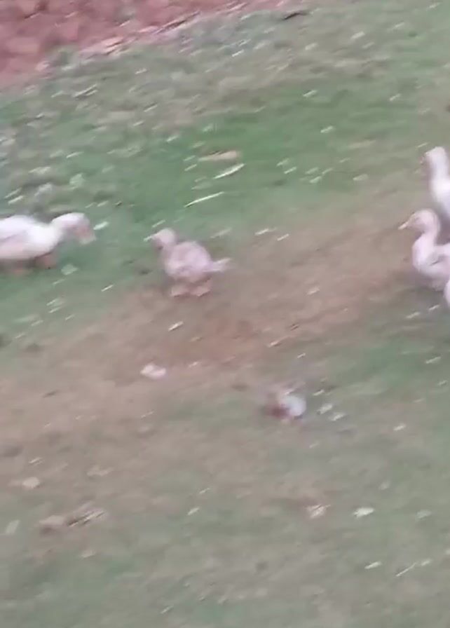 small flock of white-ish ducks moving around on a patch of grass. The grass is green but appears somewhat patchy, with some brown areas and scattered debris. There are about six ducks visible in the frame, and they are walking and foraging in different directions. In the background, there is a patch of dirt and some sparse vegetation. The video is slightly shaky and the focus is not perfect, but the ducks are clearly visible and identifiable.