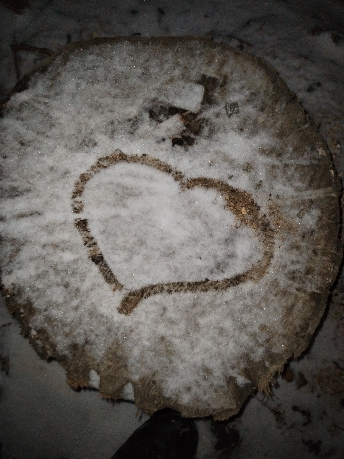 A snow-covered tree stump is visible. A heart shape has been drawn in the snow on the stump's surface, revealing the underlying wood. The snow is lightly scattered across the stump, with some areas having more coverage than others. The stump appears aged, with rough edges and varied textures. Dark surroundings suggest an outdoor, possibly nighttime setting.