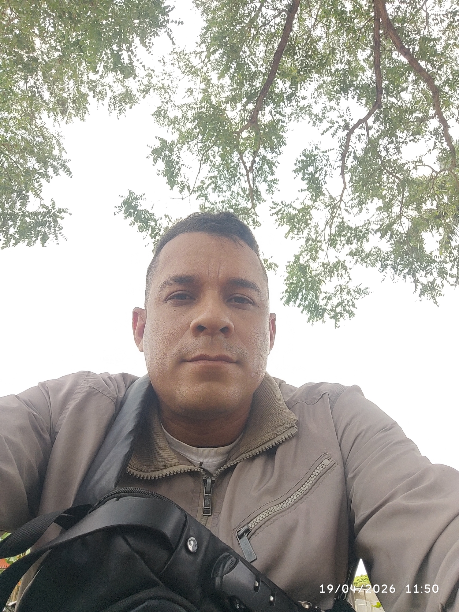 A man is taking a selfie while looking at the camera. He is wearing a light brown jacket and has a black bag strapped across his shoulder. He is standing under a tree with green leaves. The time and date "19/04/2026 11:50" are visible in the bottom right corner of the frame. The location is likely Tinaquillo, Venezuela.