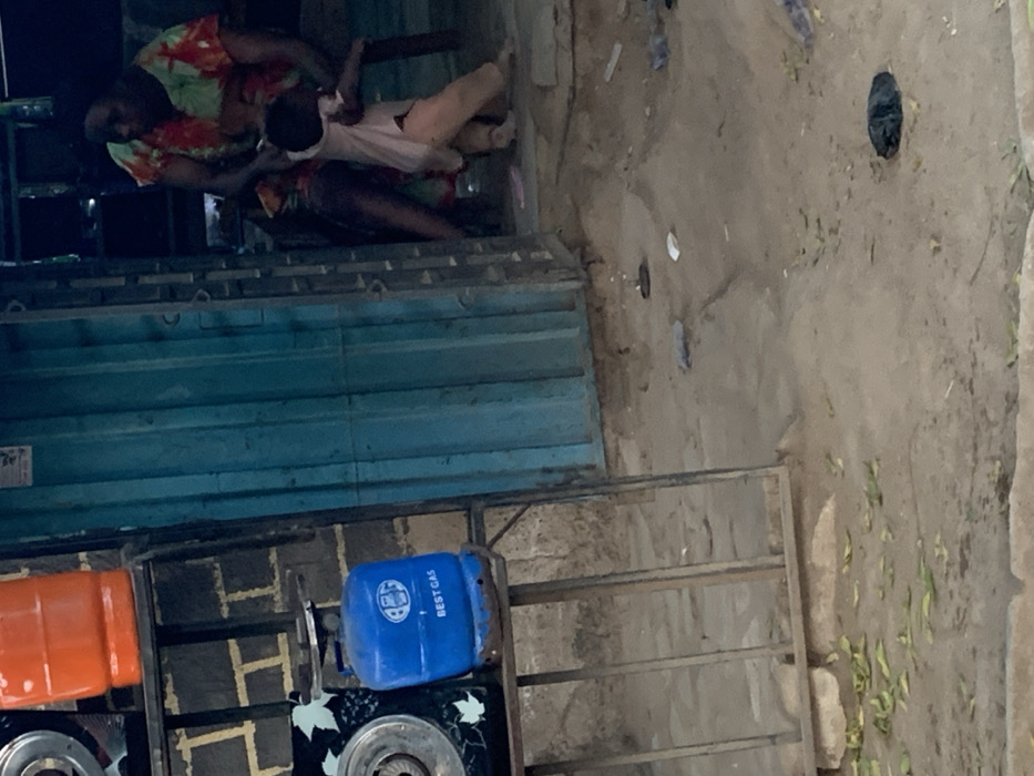 A child lies on top of an adult woman wearing a colorful top in what appears to be an outdoor space. To the left, there's a blue metal structure above an orange gas tank on a stove. A blue gas tank labeled "BEST GAS" sits beside it. The ground is dirty with scattered debris, and a dark, round object is visible on the ground in the background. The overall scene looks cluttered and potentially unsanitary.